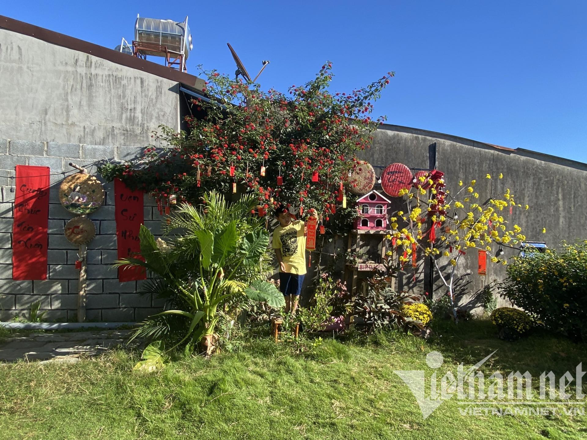 Những chiếc đèn lồng, câu đối, pháo giấy, lì xì… được chị Phước và con trai khéo léo bày biện, tạo nên những góc xinh xắn trong vườn. Hai mẹ con vừa làm vừa tỉ tê “buôn chuyện”, tiếng cười giòn tan.